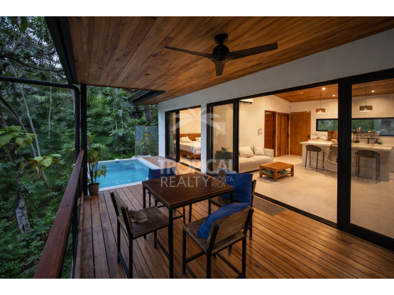 El área exterior es uno de sus principales atractivos, con una terraza privada, piscina y jardines tropicales que crean un ambiente perfecto para el descanso o alquiler vacacional.